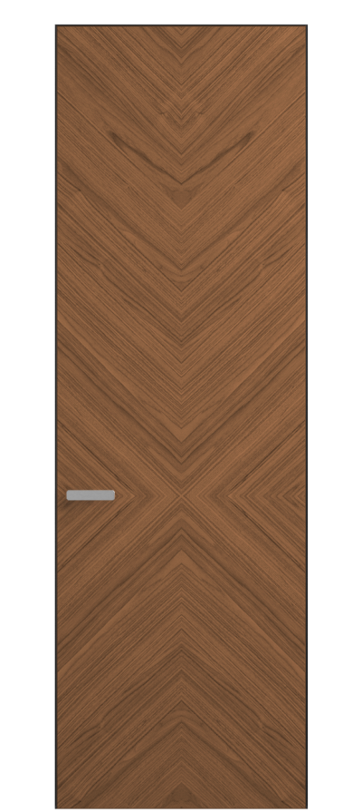 Полотно Рифт в скрытом алюминиевом коробе становится полноценным элементом декора. В коллекции представлено 9 моделей дверей в высоте до 3 метров. Рисунок раскладки шпона варьируется от простого до сложного. «Рубашка» для каждого полотна подбирается вручную по цвету, текстуре и фактуре.